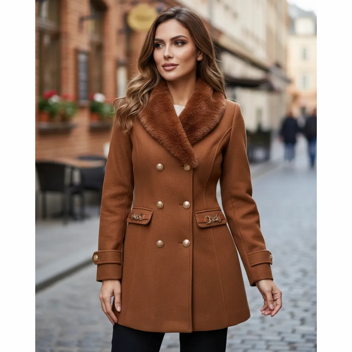 Casaco Feminino Sobretudo Elegante Gola Peluciada Inverno Marrom